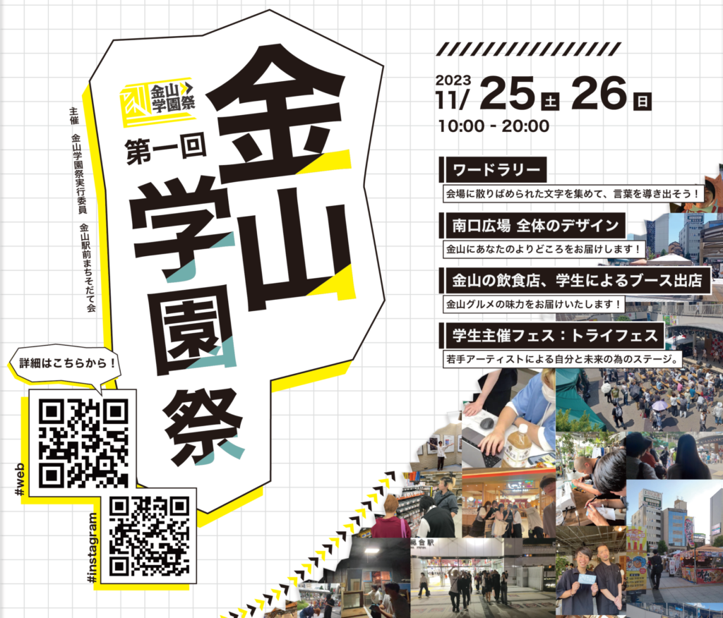 金山学園祭を支える5つの班のご紹介! よりどころ班建築学生が人々の「よりどころ」を作ってみた。 ステージ班金山をエンタメのまちに。 企画班学園祭の「楽しい」を作る。 屋台班南口に限定カフェオープン。 情報班デザインの力で学園祭を世に発信。